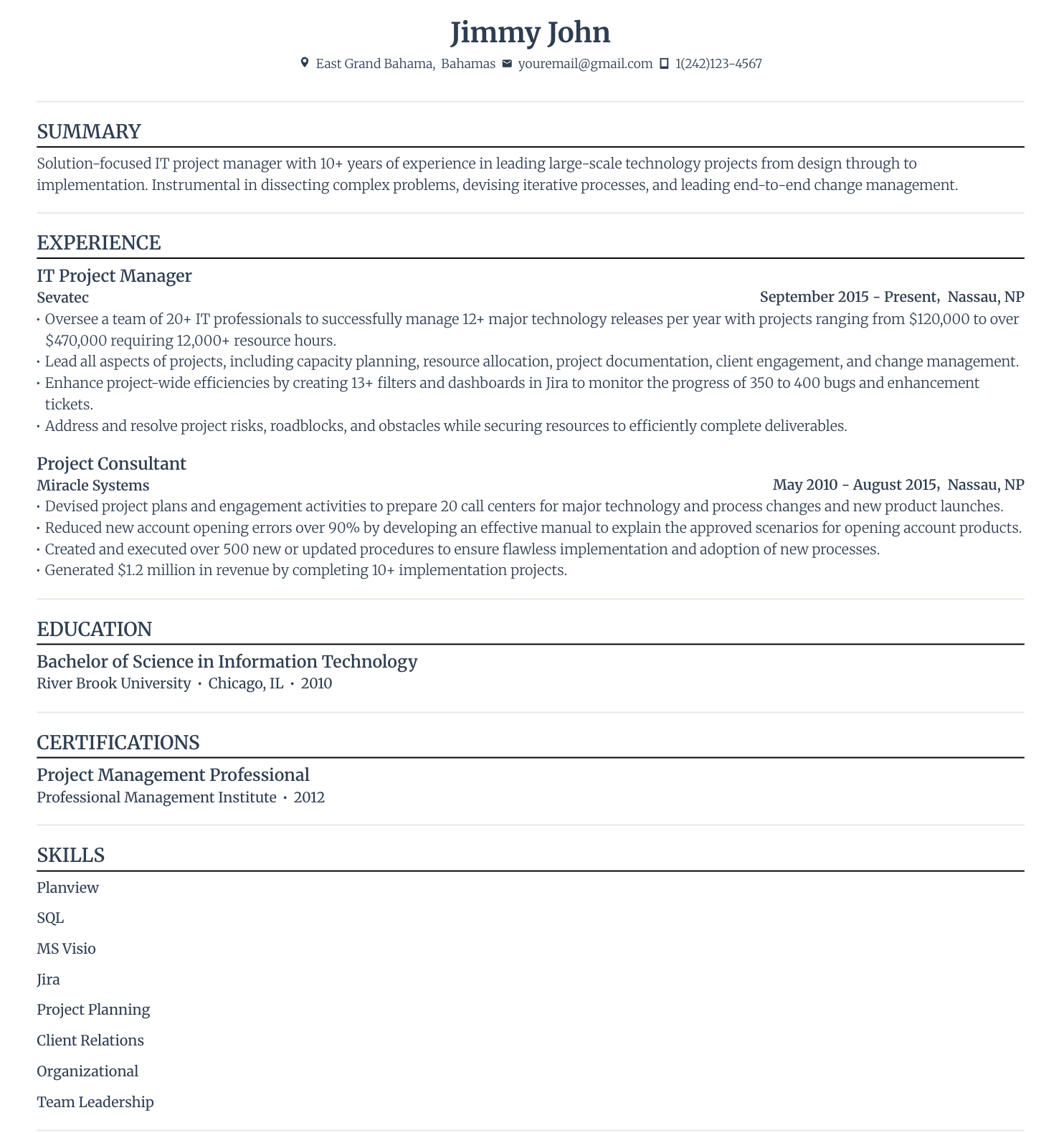 Why this resume works: This IT project manager resume highlights leadership in IT project management with clear examples of process improvement, system implementation, and measurable cost savings. It also emphasizes versatility by showcasing experience in customer service and operations, making it well-suited for federal project management roles.