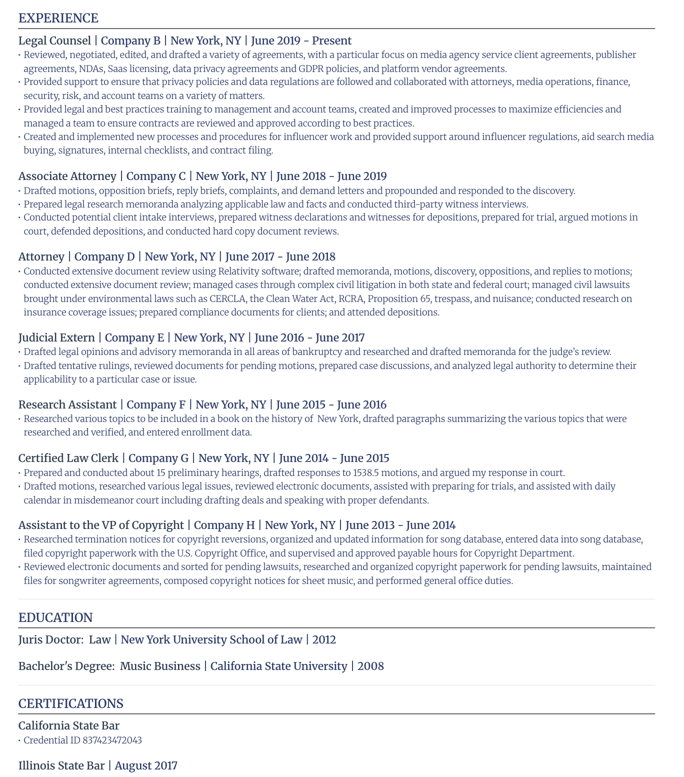 Why this resume works: This legal counsel resume stands out by clearly detailing courtroom, advisory, and contract experience across multiple roles, showing a strong progression of responsibility. It also highlights bar certifications and specialized expertise in contracts, data privacy, and GDPR, skills that are highly relevant for government and corporate legal positions.