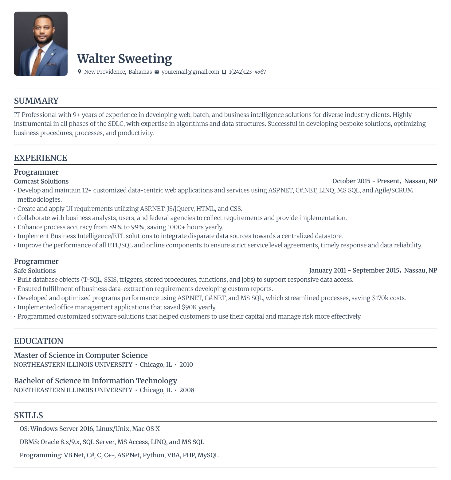 Why this resume works: This programmer resume highlights strong technical breadth by showcasing expertise across multiple programming languages, operating systems, and databases. It balances project-specific achievements, like cost savings and performance improvements, with a solid educational background in computer science and IT.