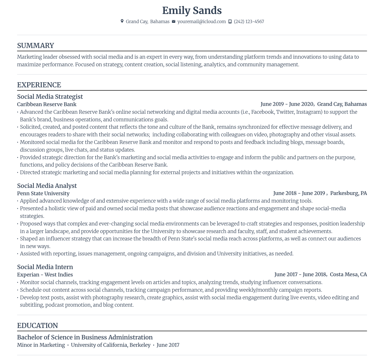 Why this resume works: This social media strategist resume demonstrates measurable success in social media growth, showing clear metrics like increased impressions, follower counts, and engagement. It also emphasizes versatility by including roles across strategy, management, and influencer marketing, supported by relevant industry and technical skills.