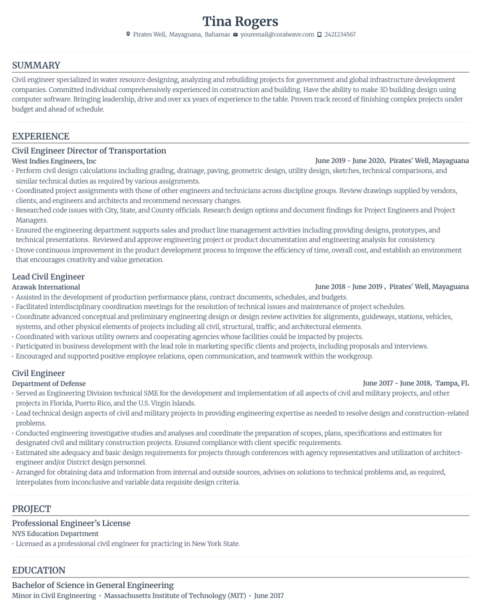 Why this resume works: This civil engineer resume reviews the applicant’s extensive engineering work history, including a role at the Department of Defense. It combines strong project-based experience with advanced education in civil engineering, making it ideal for federal applications.