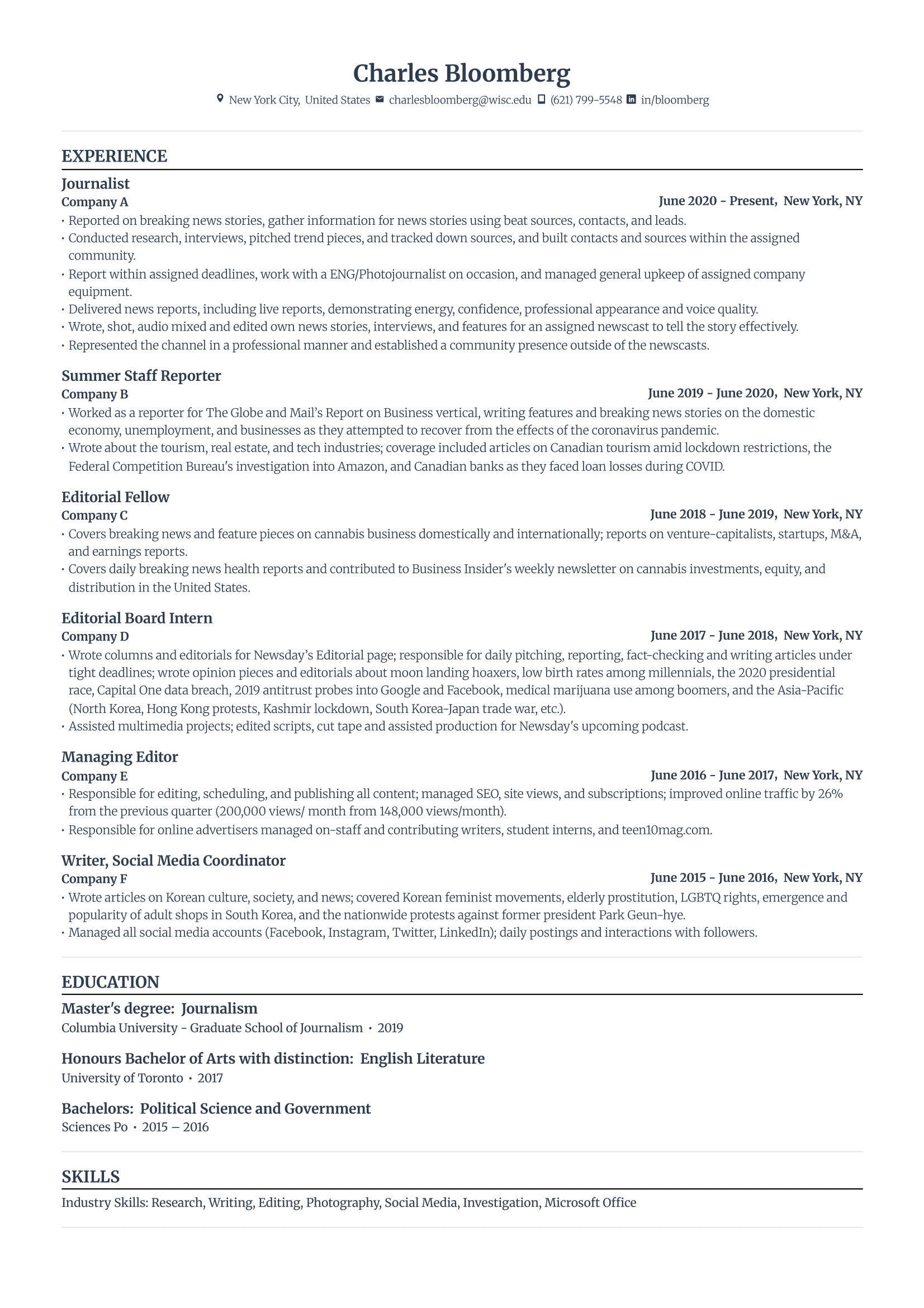 Why this resume works: This journalist resume shows a strong background in journalism with clear examples of investigative reporting, editorial leadership, and multimedia skills. It balances newsroom experience with digital media expertise, showing versatility across traditional and modern platforms.