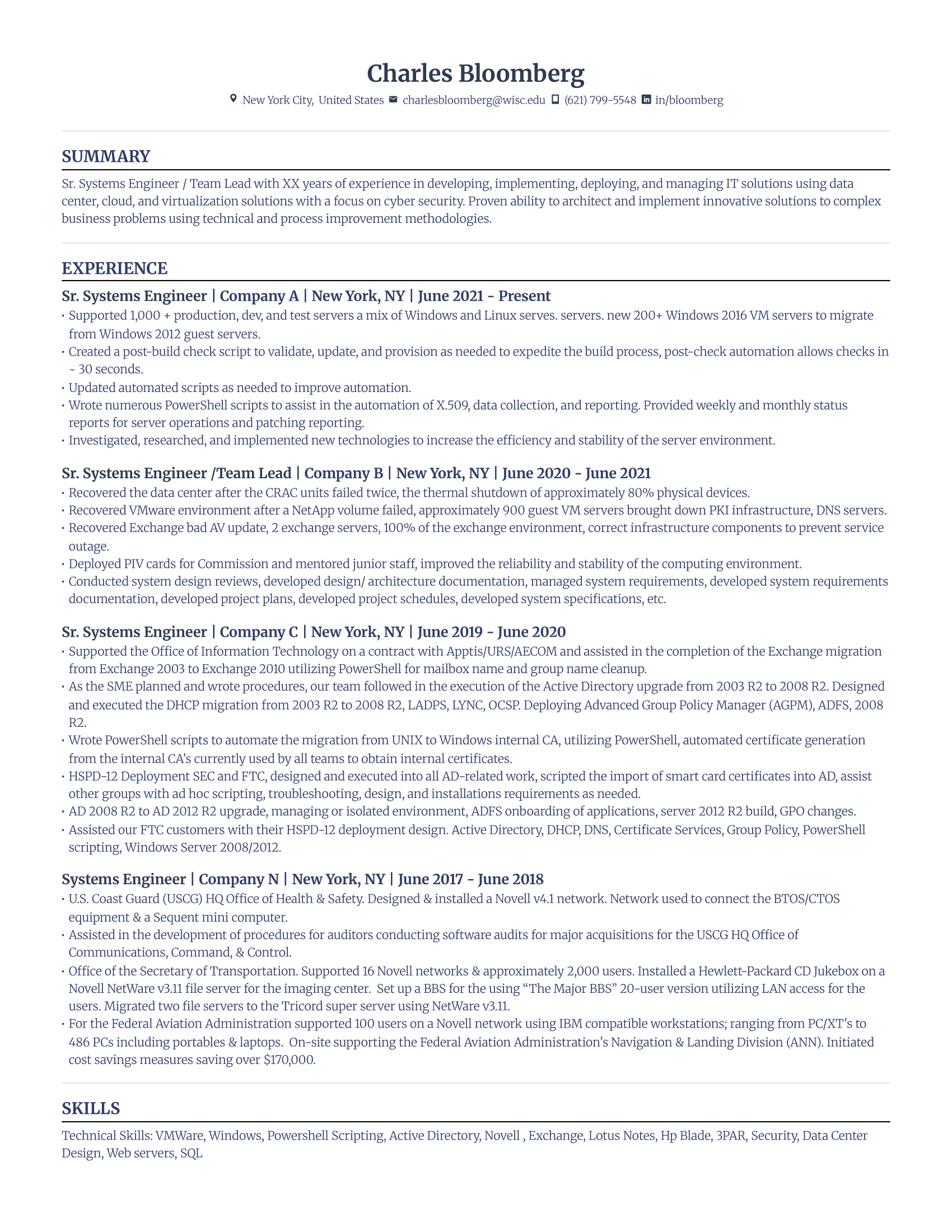 Why this resume works: This senior systems engineer resume highlights complex IT projects with measurable outcomes, such as large-scale server migrations and automation scripting. It balances technical expertise with leadership experience, showing both hands-on skills and the ability to mentor teams.